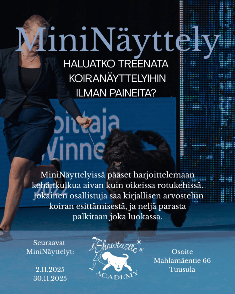 MiniNäyttelyssä pääset harjoittelemaan kehänkulkua eli kehä käydään läpi kuin rotukehissä. Erinomainen tilaisuus harjoitella kilpailutilannetta ja saada palautetta omasta esittämisestä! Messari MiniNäyttelyssä luokat on jaettu FCI roturyhmittäin.