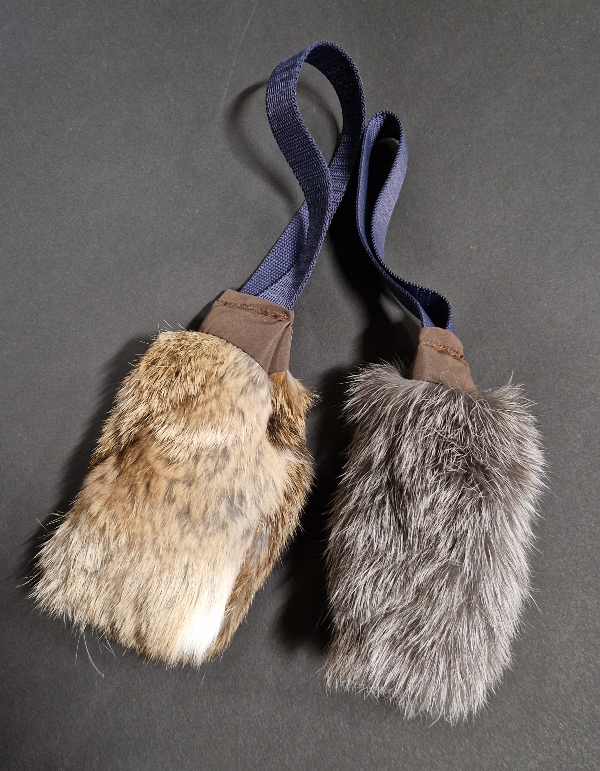 Leikki- ja palkkauskäyttöön sopiva kaninkarvariepu lyhyellä käsilenkillä ja vingulla. Materiaalina on parkittua, pehmeää kanintaljaa. Talja on parkittu alunalla.